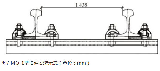 钢桥明桥面木枕采用K 型扣件,为无挡肩结构扣件,因此合成轨枕也使用该类扣件。典型的无挡肩扣件包括WJ-7 型、DT-Ⅱ型扣件等,具有扣压力大、弹性好、轨距保持能力强等特点。合成轨枕为等截面中空结构,可在轨枕上安装具有承轨槽的铁垫板。铁道科学研究院集团有限公司针对该合成轨枕及明桥面木枕开发了MQ-1 型扣件(图7)[12],在扣件连接设计上充分利用了轨枕的中空结构,在轨枕内腔设置贝母,用于固定与铁垫板连接的锚固螺栓。
