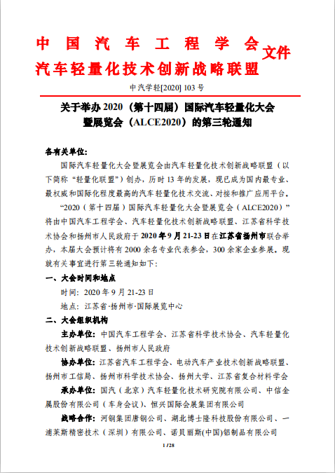 关于举办 2020(第十四届)国际汽车轻量化大会暨展览会(ALCE2020)的第三轮通知
