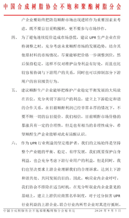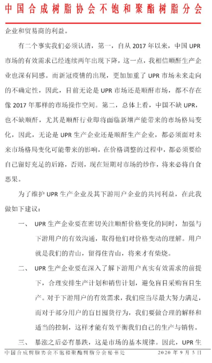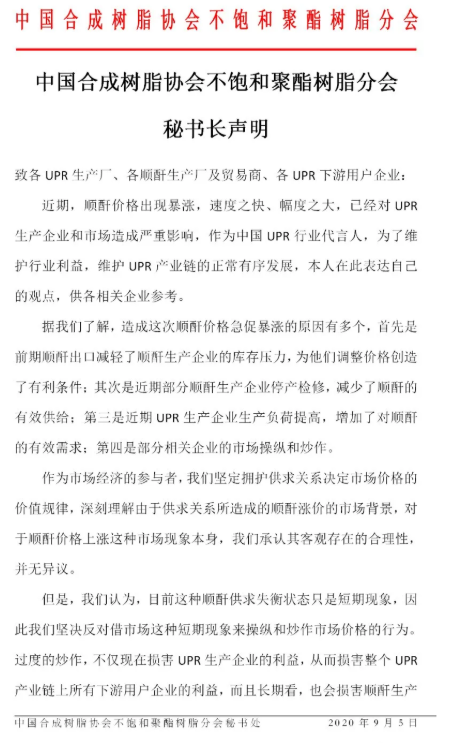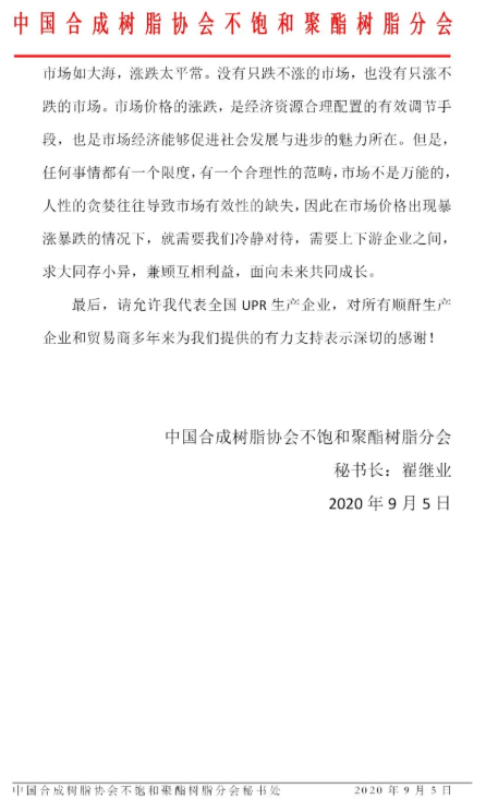 合成树脂协会不饱和聚酯树脂分会 秘书长声明