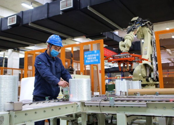 泰山玻纤新材料生产线上,工人正在规范进行生产作业。