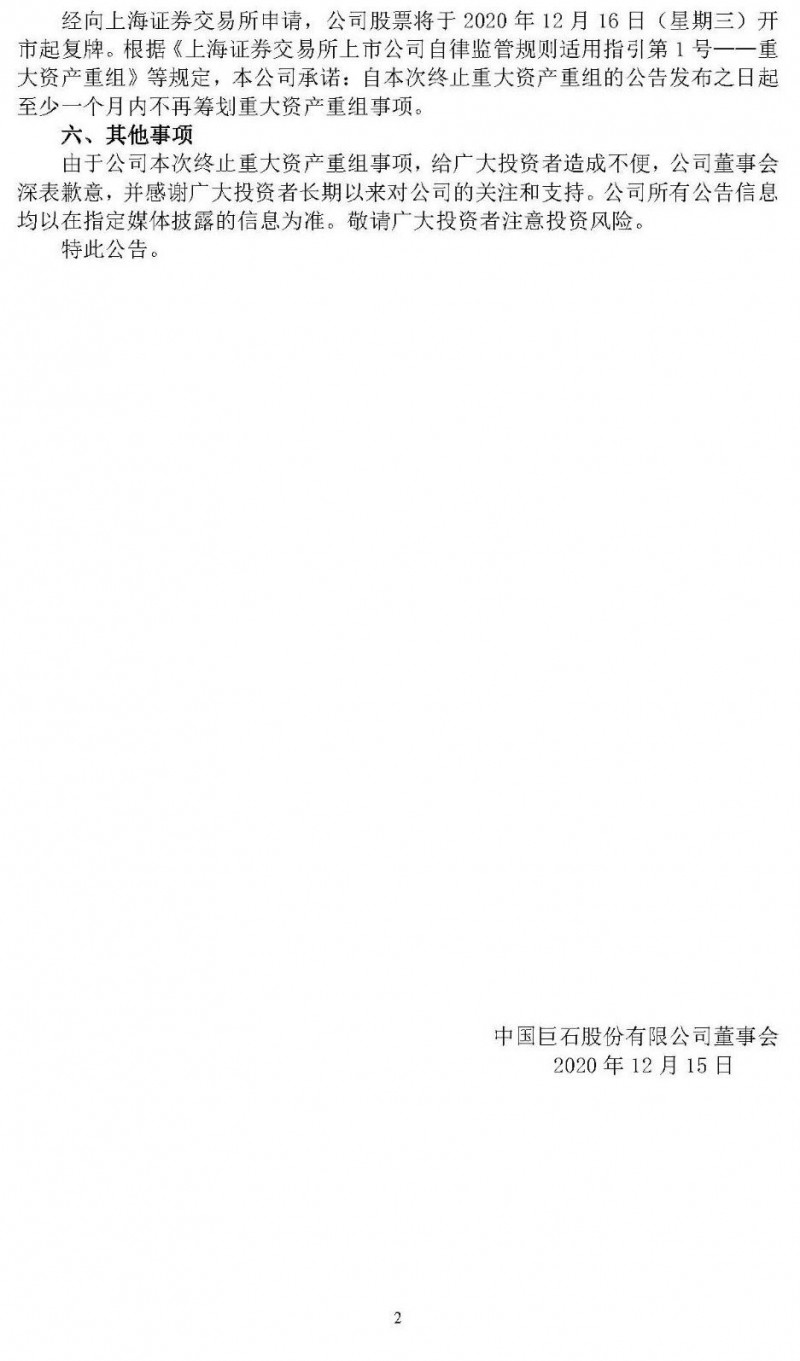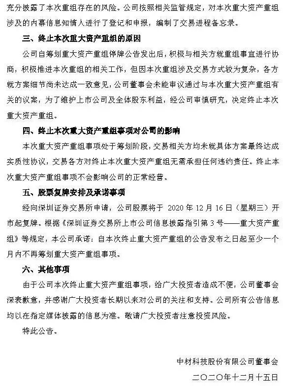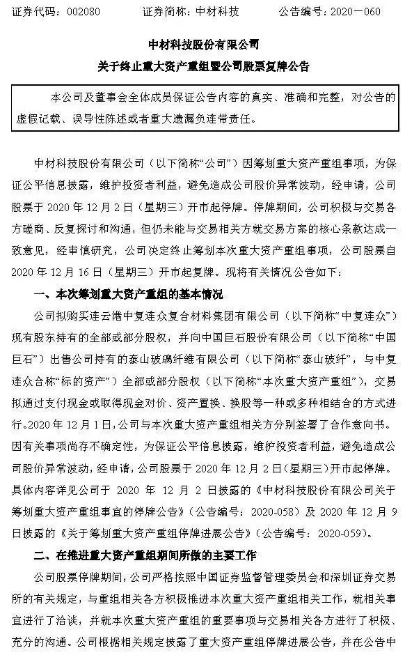 12月15日晚间,巨石股份有限公司与中材科技股份有限公司分别发布公告称,因筹划重大资产重组事项,为保证公平信息披露,维护投资者利益,避免造成公司股价异常波动,经申请,两公司股票于2020年12月2日(星期三)开市起停牌。鉴于目前仍未能与交易相关方就交易方案的核心条款达成一致意见,经审慎研究,决定终止筹划本次重组事项,两公司股票自2020年12月16日开市起复牌。