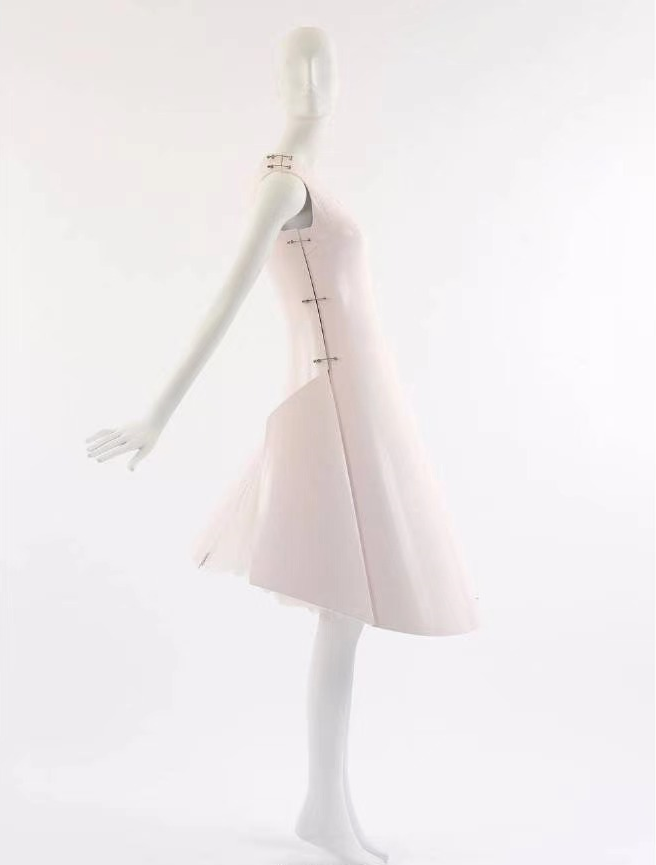 来自塞浦路斯超前意识的时装设计师HusseinChalayan创造的该款连衣裙于2000年在法国耶尔节上次展示,使用玻璃纤维和树脂复合材料在一个特别设计的模具中锻造,特点是手动操作的襟翼,打开以展示大量粉色泡沫薄纱。
