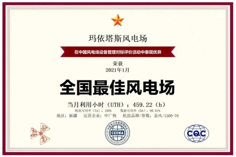 该奖项由电力设备管理协会根据《风电场设备管理对标评价办法》和《风电场设备管理对标评价技术规范》等规则评选,每月在范围内仅评选出1个“佳风电场”,每年根据对标指数排名情况进行年度评选。在近日公布的1月排名中,中广核玛依塔斯风电场凭借459.22h发电小时数、100%机组可用率、99.81%数据可用率等指标的优异表现,当选“佳风电场”。