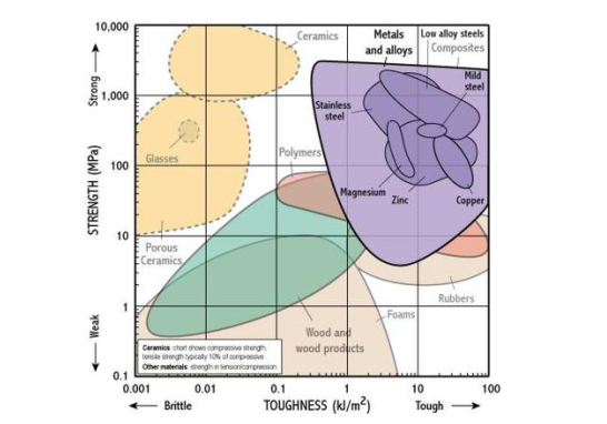 图中纵轴 Strength 就是抗拉强度,而横轴 toughness 就是断裂能量,右上角深紫色的 composites 纤维复合材料和淡紫色的 metals and alloys 金属材料。由此图我们可以看到,FRP 碳纤维增强复合材料和传统的金属材料的韧性,抗冲击性相差不大。比如同样是金属材料,铜的韧性强于钢材,但是强度却明显低于钢材,而低合金钢的强度相比钢材有大幅提升。