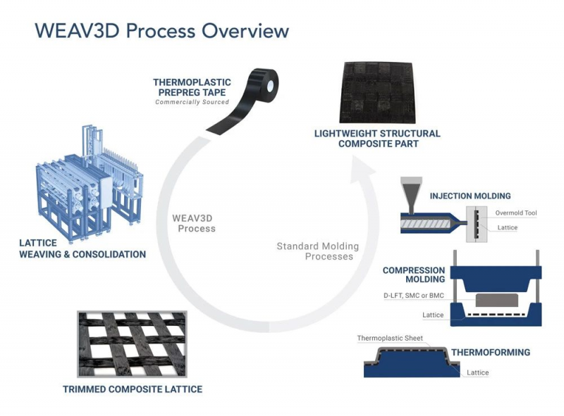 WEAV3D正在申请的复合材料成型工艺,可以支持每年数十万辆汽车的生产,能够采用单向纤维增强复合材料带材,生产出一种编织的复合材料晶格结构——一种被称为“塑料用钢筋”的设计概念,然后再采用传统的成型工艺,将这些复合材料晶格结构二次成型为终的结构部件。