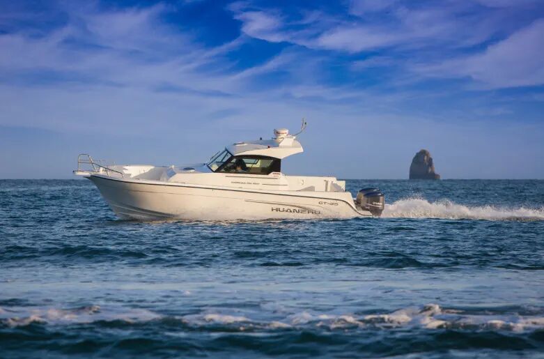 GT-35钓鱼艇抗浪性极佳,在同类别产品中属佼佼者。艇长10.5m,宽2.90m;燃油舱容1000L,定员8人,高航速37节,发动机马力为175-200HP×2。