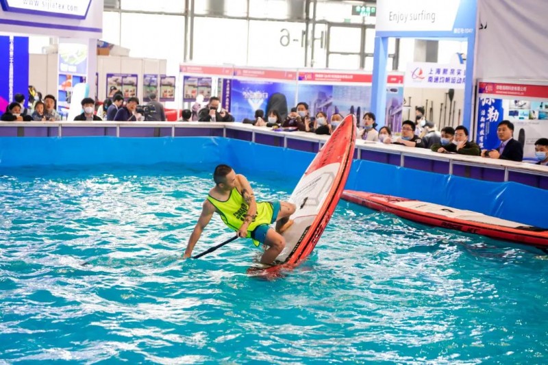 现场设置泳池展示水中载人飞行器,水上浮毯竞跑,尾波冲浪,水上马球等有趣新颖的水上运动。