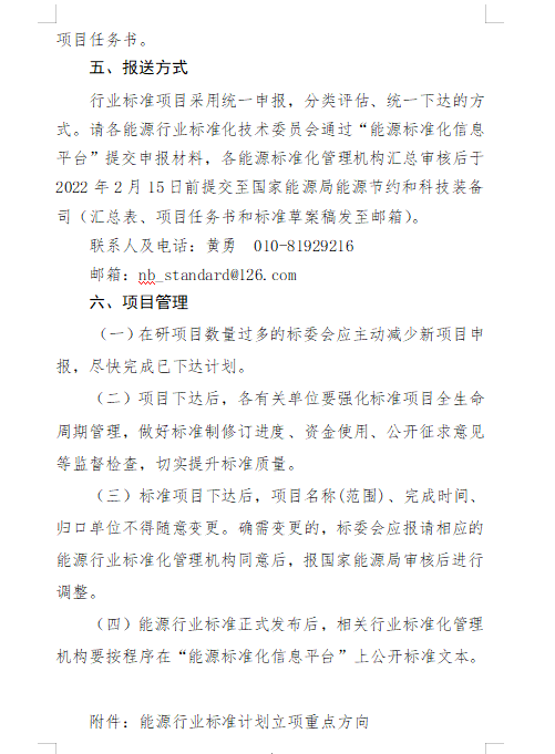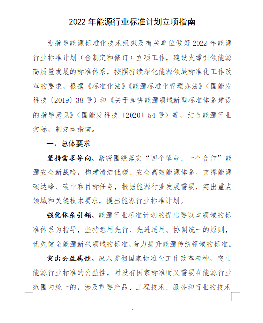 按照能源局标准化工作安排,为明确2022年能源行业标准立项重点方向,我们组织编制了《2022年能源行业标准计划立项指南》。现印发给你们,请按照指南明确的要求,做好2022年能源行业标准计划立项工作。