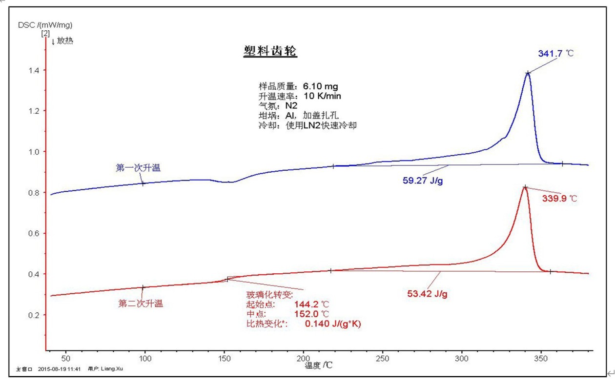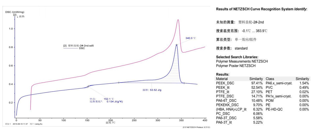 基于图 4 中的第二次升温曲线,发现与 PEEK 理论报导的相关特征温度(玻璃化温度:145~155℃,熔点:335~345℃)十分相似,判断塑料齿轮材料应为 PEEK。