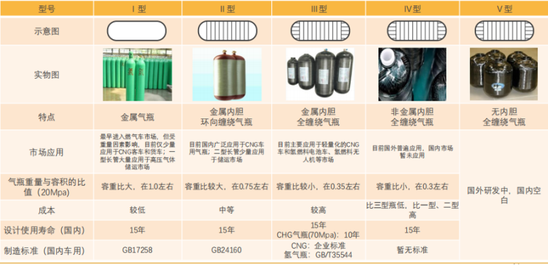 目前从技术角度看,高压气态储氢容器主要分为纯钢制金属瓶(I型)、钢制内胆纤维缠绕瓶(II型)、铝内胆纤维缠绕瓶(III型)及塑料内胆纤维缠绕瓶(IV型)四级别产品。