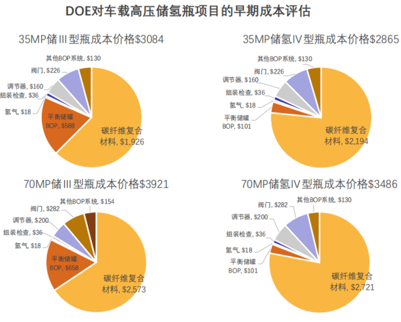 根据DOE对车载高压储氢瓶项目的早期成本评估可以发现,无论是35MPa,亦或是70MPa,总体而言,III型高压储氢气瓶成本都要略高于IV型,其主要原因在于,III型瓶储罐采用大量金属铝材料。