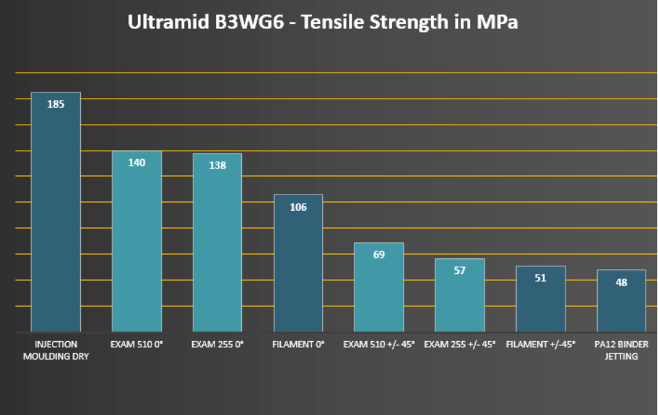 先,在带有PA6GF30的ExAM 255和ExAM 510机器上打印了拉伸棒。3D打印网的取向是可变的 - 0°用于与拉伸方向一致的铺层(纤维的取向也在拉伸方向上),±45°用于交替方向为±45°的模式。与注塑成型的PA6GF30,可比较的PA6GF30长丝和通常用于3D粉末床打印的PA12材料进行了比较。