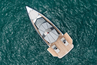 Wallytender43 借鉴了沃利帆船的传统,在碳纤维 T 型顶部采用层压帆布,让大量自然光进入驾驶舱,同时保护客人免受阳光照射并减轻重量。