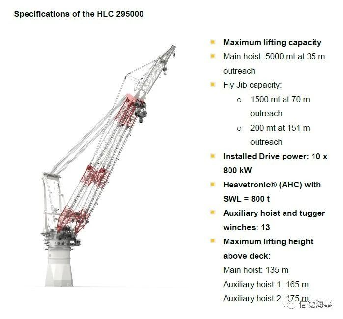 2019年10月4日下午三点三十分,大吨位风电安装船“ORION I”轮从江苏启东启航,驶往欧洲。“ORION I”轮总长216.57米,宽49米,型深16.8米,设计吃水8.5米,设计航速14节,使用LNG作为动力燃料,并具有LNG冷能再利用、热能回收功能,绿色环保。 该轮配备一台起重能力为5000吨的全回转重吊,大提升高度170米,可以运输目前市场上重的风电单桩基础、导管架基础以及风机各部件,是上吨位大、先进的风电安装船舶。 2019年11月23日抵达德国罗斯托克,Liebherr为该轮在罗斯托克安装一座型号为HLC 295000,起重能力为5000吨大提升高度170米的全回转重吊。2月末,该吊的安装工作顺利完成。但在5月2日船吊厂商Liebherr的工作人员对该吊的负载测试中,事故就发生了。HLC 295000对于Liebherr也是一种全新的挑战,由于这些起重机的复杂性和尺寸,只有少数生产商能够满足所需的技术要求,并具有足够的生产能力,Liebherr是少数具备这种生产能力的企业。 HLC 295000是利勃海尔迄今建造的大的海上起重机。它的起重能力为5000吨,延伸范围为30米。HLC的吊臂长160米,而整个起重机的高度为90米。为了安装巨型HLC 295000,使用了近投入使用的TCC 78000轨道式重型起重机。TCC 78000的起重能力为1600吨,大起重高度为158米。