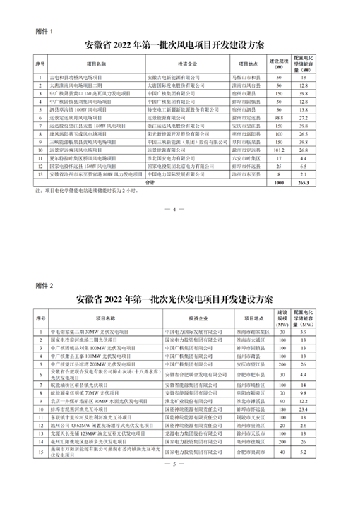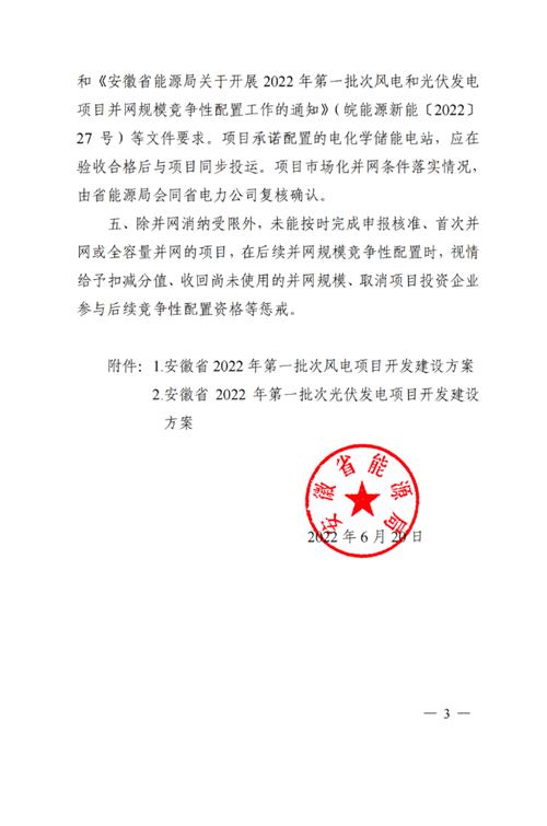 7月4日,安徽省能源局发布《关于追加2022年风电和光伏发电项目建设规模的公告》,文件提出,拟在已下达安徽省2022年批次风电和光伏发电项目建设规模基础上,追加风电和光伏发电项目建设规模200万千瓦,其中风电项目100万千瓦、光伏项目100万千瓦。将继续采用安徽省2022年批次风电和光伏发电项目并网规模竞争性配置的规则和结果,按照申报项目综合评审得分由高到低依次确定2022年追加风电和光伏发电项目建设规模的项目清单。