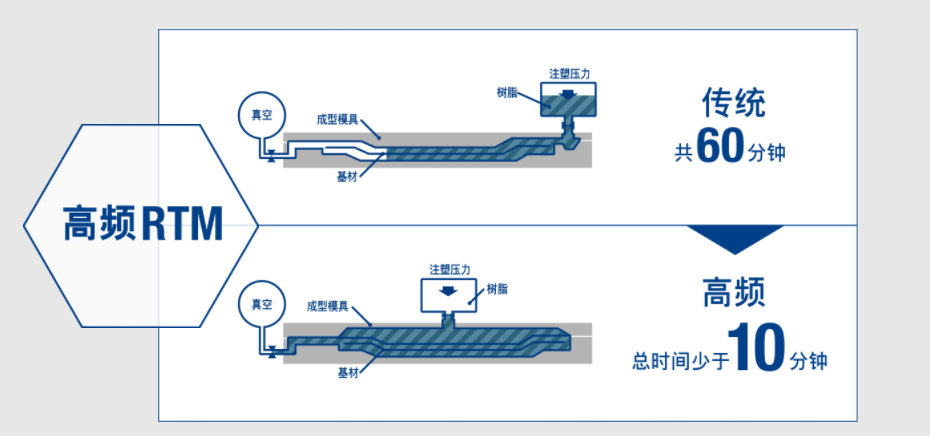 作为热固性CFRP成形技术之一的“RTM成形法”,为了实现成型周期的高速循环,成型时采用通过多点注入法的高速树脂浸润技术及超高速固化树脂技术,可使时间大幅缩短。