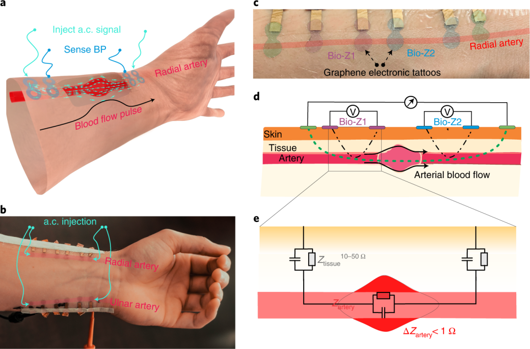 生物阻抗测量 (Bio-Z)具有通过电流的深度穿透来检测埋藏组织的能力,从而有助于直接从动脉对血流动力学参数进行强大的传感。自粘、低阻抗石墨烯电子纹身 (VET)放置的BP模型在一开始就确定,无需为每个电极放置重新校准模型,这里的石墨烯支持BP(Z-BP)技术不会受到电极错位或传感器移动的影响,也不需要骨骼的存在。