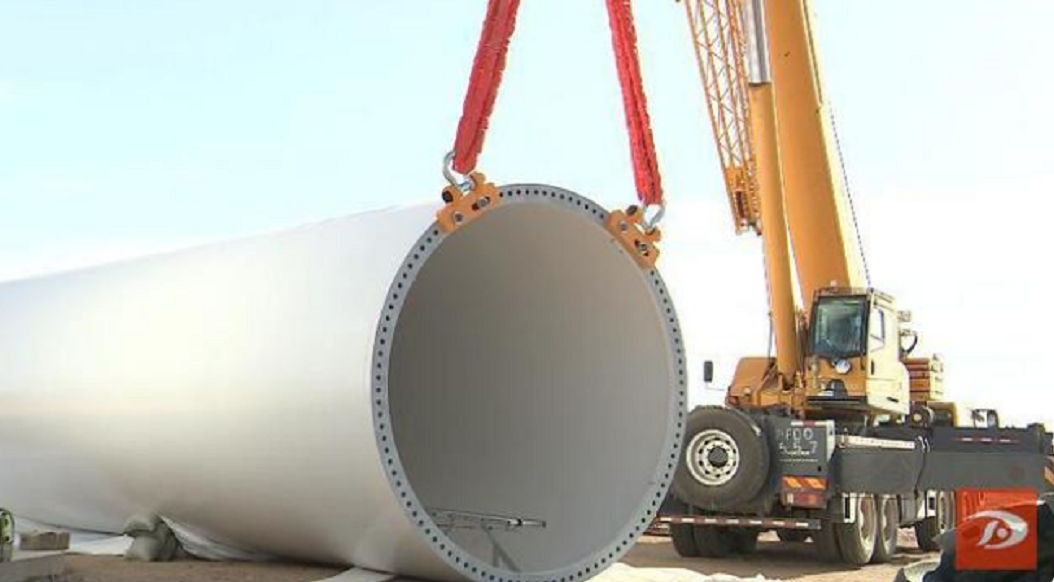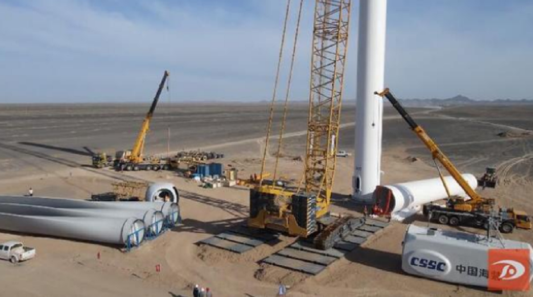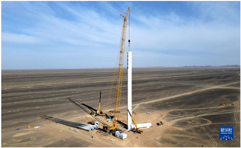 7月2日,在甘肃敦煌海装北湖49.5兆瓦风电项目建设现场,工人在进行吊装作业。新华社发(张晓亮 摄)
