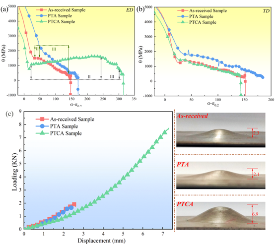 重点研究了AZ31镁合金的加工硬化行为和成形性能,如图2所示。一般来说,镁合金位错滑移的应变硬化主要变形模式为三个阶段:(1)短弹塑性转变阶段;(2)几乎恒定应变硬化阶段;(3)递减线性应变硬化阶段。应变硬化速率θ=dσ/dε,其中σ和ε分别为真应力和真应变。原始样品平滑阶段的θII和线性阶段的θIII在屈服后,因为短弹塑性过渡而减小。预压缩产生的{10-12}双织构和低屈服强度导致PTCA试样(由PTC样品在 623 K下退火1 h得到)θII阶段的长度和应变硬化速率显著增加。预压缩诱导的{10-12}拉伸孪晶取向有利于基面滑移,增加了基面滑移对塑性应变的贡献,增加了流变应力(σ - σ0.2)。此外,因位错密度的不同和c轴//ED的{10-12}拉伸孪晶织构的影响,在ED方向的载荷作用下,PTCA试样的θIII值高,可提供额外的加工硬化效果,成为位错滑移的障碍。在室温成形性方面,激活{10-12}孪晶活性可导致PTCA样品具有较低的拉伸YSED和较高的面内各向异性。预压缩变形也提高了镁合金室温延性,其中PTCA试样延伸率为29.7%,板材拉伸成形能力比原始试样提高了3倍,IE值为~ 6.9 mm。在//ED应变预压缩过程中,晶粒具有高CRSS值的硬取向,有利于锥面滑移和{10-12}孪晶形成。