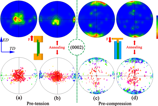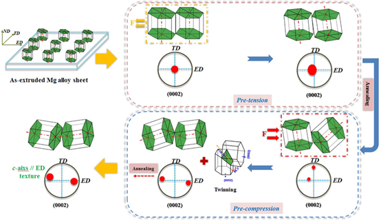 随着汽车、轨道交通等向轻量化、低能耗、高速、高可靠性方向发展,迫切需要高性能的轻量化材料。镁合金作为轻的金属结构材料,具有比强度高、阻尼性能优异、可循环利用等优点,被认为是对钢铁、铝合金、钛合金等传统金属材料的重要补充,以提高运输中的能源效率。然而,镁合金具有密排六方晶体结构(HCP),室温下能够开动的独立滑移系较少,因而在塑性变形时易形成强基面织构导致其室温塑性成形能力差。如何解决塑性加工过程出现的关键基础问题,特别是变形镁合金的微观组织调控机制及晶粒转动机理,已成为当前变形镁合金板材的研究热点和重点之一。为此,研究人员提出了一种基于预变形实现取向调控的方法,在不同应变激活条件下,诱发更多的孪晶取向织构和<c + a> 位错活性,提高镁合金塑性变形能力,为设计高强韧镁合金材料提供新思路,同时也为研发高性能密排六方金属材料提供新途径。