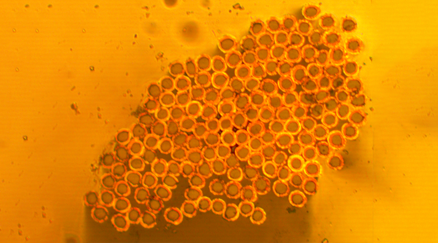 大连义邦Syscom镀金属纤维丝,采用专有的化学电镀工艺,将金属涂层与基材牢固的结合在一起,通过电镜观察,一股PBO纤维有166根,下述圆形代表纤维的横截面,圆环代表金属涂层,通过观察,发现一股PBO纤维里面的166根,每根都有圆环包覆,均匀且牢固的与非金属基材结合在一起,金属结合度高达80%以上,因此在实际使用的过程中,不会因为反复摩擦,清洗,导致金属涂层脱落,影响导电性,屏蔽性。