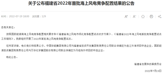 获悉,7月19日,福建省发改委发布《关于公布福建省2022年批海上风电竞争配置结果的公告》。
