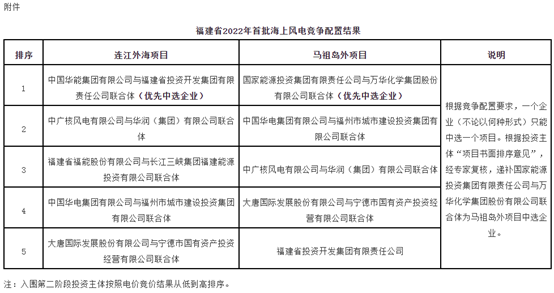 经专家评审、电价竞价和结果公示,华能集团有限公司与福建省投资开发集团有限责任公司联合体确定为连江外海项目中选企业,能源投资集团有限责任公司与万华化学集团股份有限公司联合体确定为马祖岛外项目的中选企业。