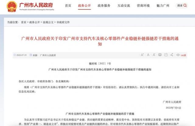 7月19日,广州市政府发布《广州市支持汽车及核心零部件产业稳链补链强链若干措施》(以下简称《若干措施》),提到了上述举措,涵盖支持构建安全可控的产业链供应链体系、近地化构建“432”汽车产业园区新格局、提升汽车产业链自主创新与核心竞争力、加快新能源汽车推广应用、以及强化要素资源供给保障(用地用房、资金、人才、用能)共五大方面。
