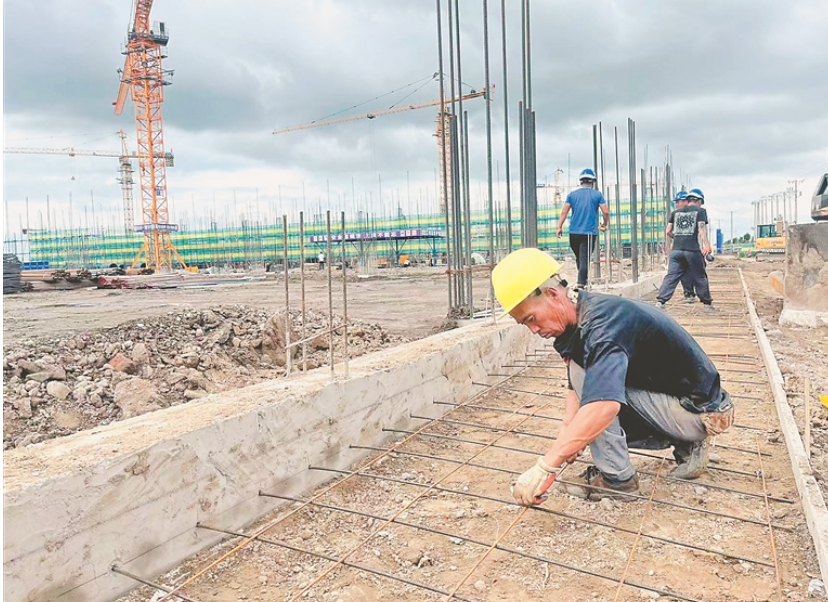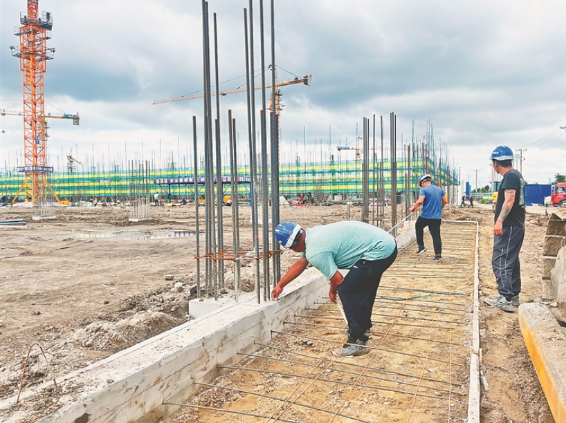吊线、绑扎钢筋、浇筑水泥,夏日骄阳下,汗水湿透了一丝不苟作业工人的衣衫。一座座塔吊的巨臂稳稳移动着,在密密匝匝的脚手架间忽隐忽现。