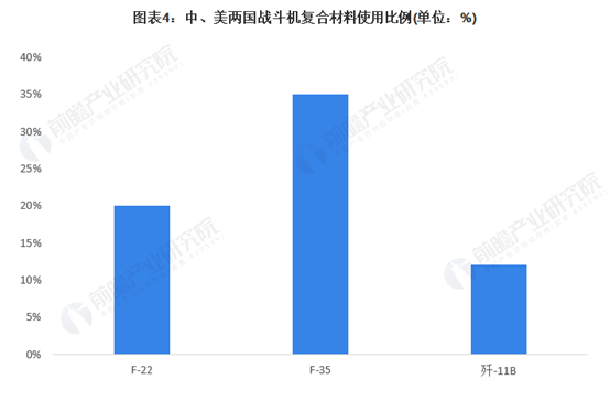 复合材料在改善飞机机体结构,降低结构重量,提高隐身能力等多个方面有着自己特有的贡献因此广泛应用于战斗机中。发达较早就将复合材料应用于战斗机制造中,美国F-22实际使用碳纤维比例高达20%,F-35中复合材料的使用比例达到了35%,具体在蒙皮和机翼结构和机体结构部件上,大量的使用了碳纤维复合材料。目前,的战斗机用复合材料的应用还有待提高,歼-11B用复合材料占比约为12%,距离发达还有一定的距离。