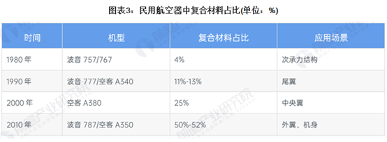 1970年,复合材料次应用至航空航天行业中,其应用范围从开始的舱门、口盖、整流罩等发展到目前已经应用于机翼、机身等主要承力结构;同时,随着伴随碳纤维等复合材料技术工艺不断提升,高性能复合材料的使用和替代范围进一步扩大,部分飞机复合材料比重已达到50%以上。