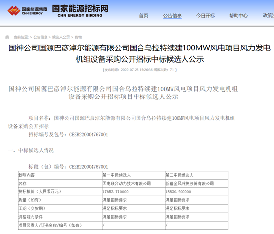 风电新闻网讯:7月26日,国神公司国源巴彦淖尔能源有限公司国合乌拉特续建100MW风电项目风力发电机组设备采购公开招标中标候选人公示,规模共计100MW,联合动力预中标,投标报价17652.71万元,折合单价1765元/kW。