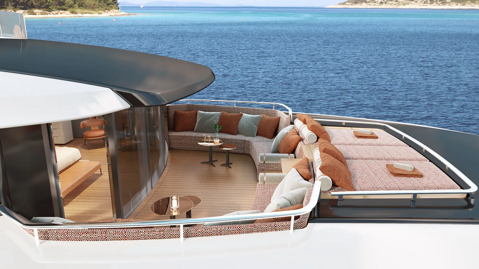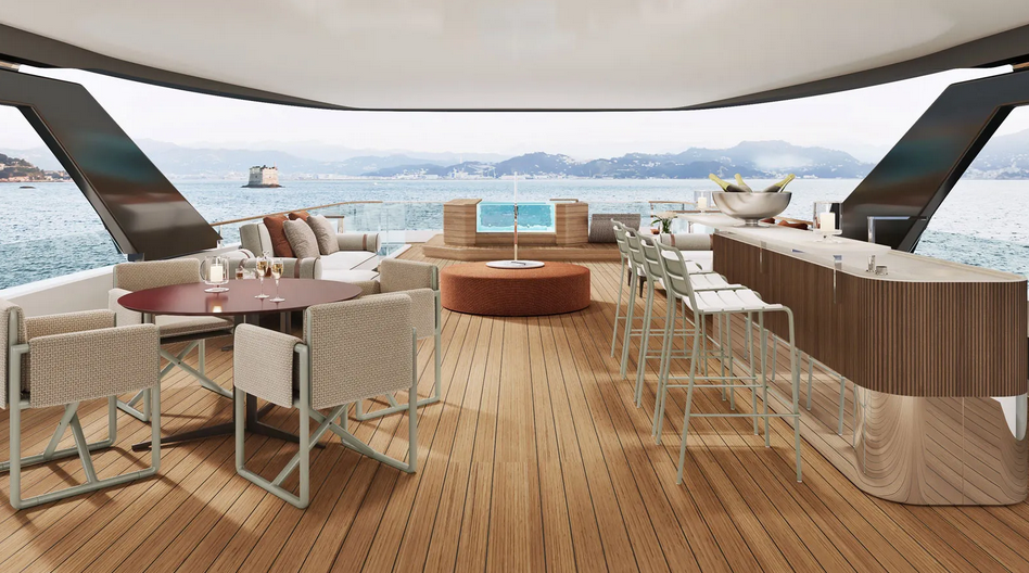 除了船尾甲板游泳池,游艇还设有一个宽敞的日光浴平台,可以配备按摩浴缸,在这里,客人还可以找到一个阴凉的休息区、美式酒吧和用餐区。