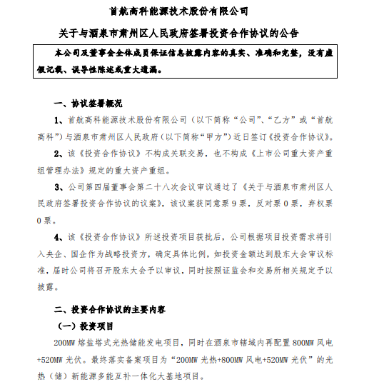 8月3日,航高科发布公告称,公司与酒泉市肃州区政府签署投资合作协议,拟200MW熔盐塔式光热储能发电项目,同时在酒泉市辖域内再配置800MW风电+520MW光伏。