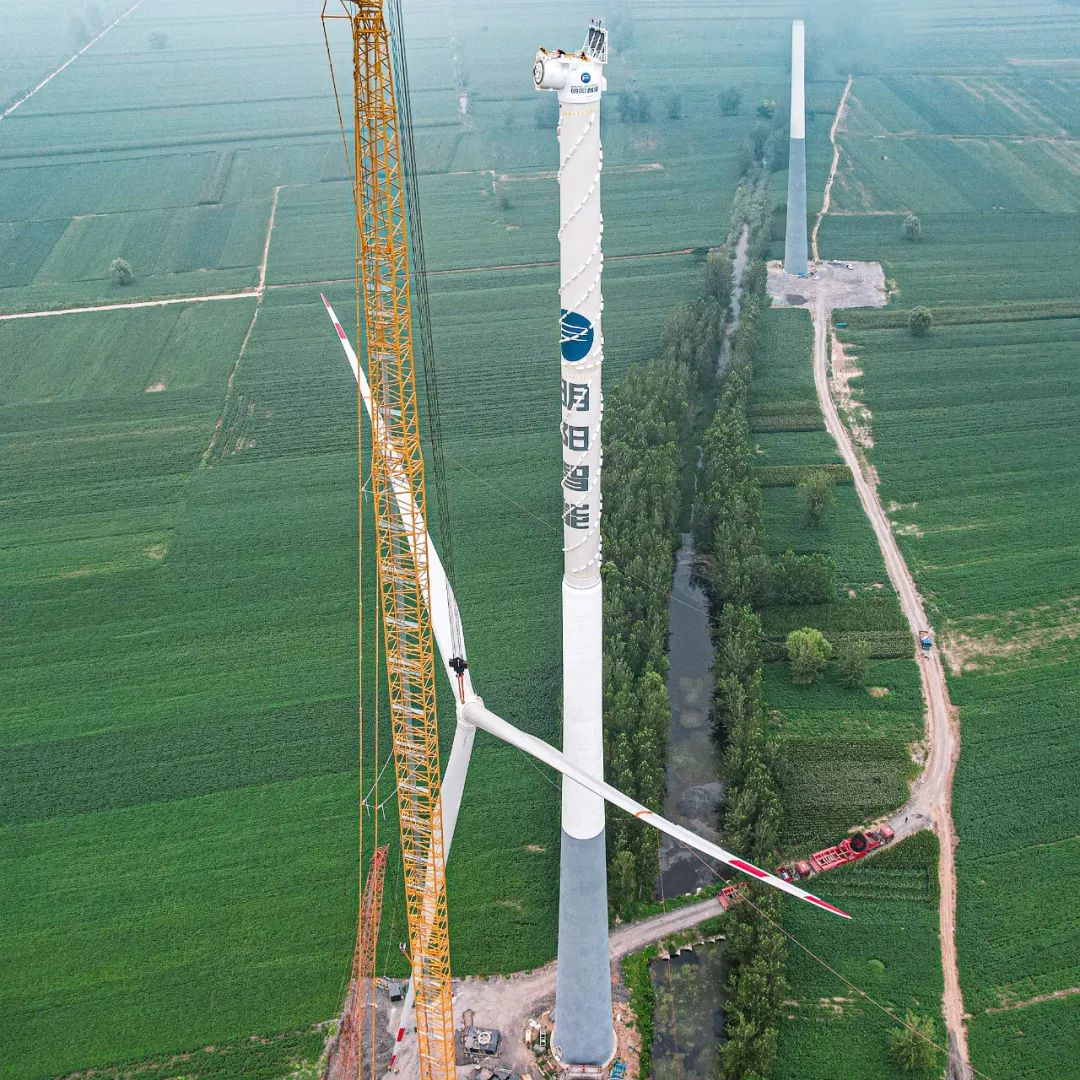 8月10日10时55分,由明阳智能自主研发设计的160米超高钢混塔架在安徽灵璧灵北风电项目成功吊装。本次台机组的顺利吊装,标志着明阳智能大容量、超高混塔产品正式进入批量商业化运行阶段。
