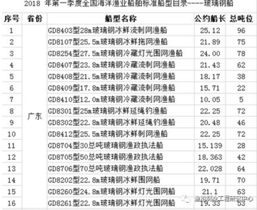2018年4月,原农业部渔业船舶检验局公布了《2018年季度海洋渔业船舶标准船型评价结果》。在此次公布的66型标准船型中,有24型为玻璃钢材质渔船,船长从6米到28米不等,涵盖流刺网、拖网、灯光围网、延绳钓、养殖等几乎所有主要作业类型。