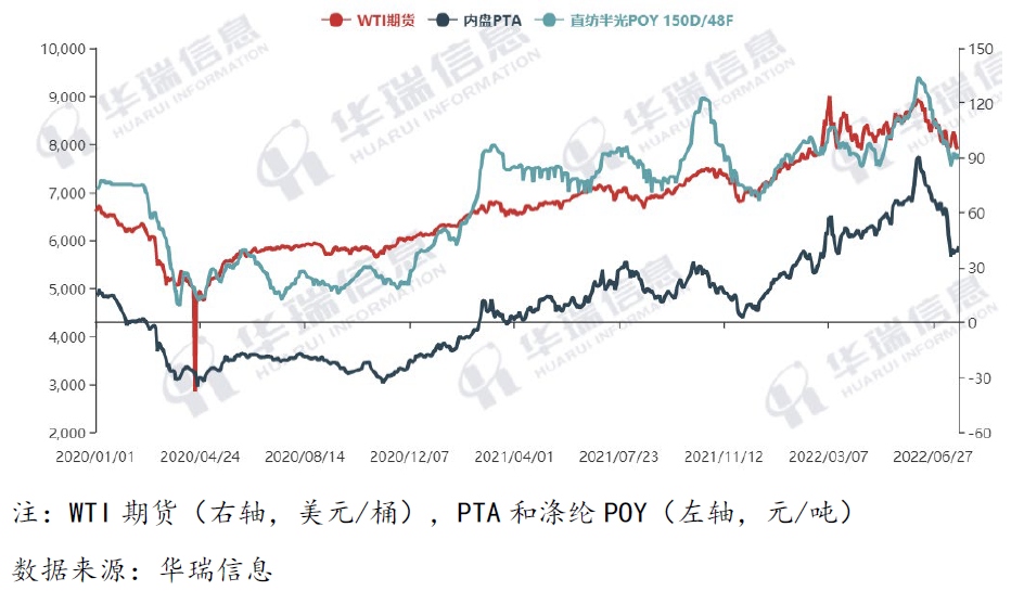 2022年以来,原油价格总体保持高位大幅波动, 3月上旬和6月上旬WTI期货两次突破120美元/桶,之后出现震荡下行趋势,6月底降至106美元/桶,7月底进一步降至94美元/桶附近,较6月高点价格下降幅度超过20%,以涤纶为代表的化纤市场也呈现高位大幅波动走势(图3)
