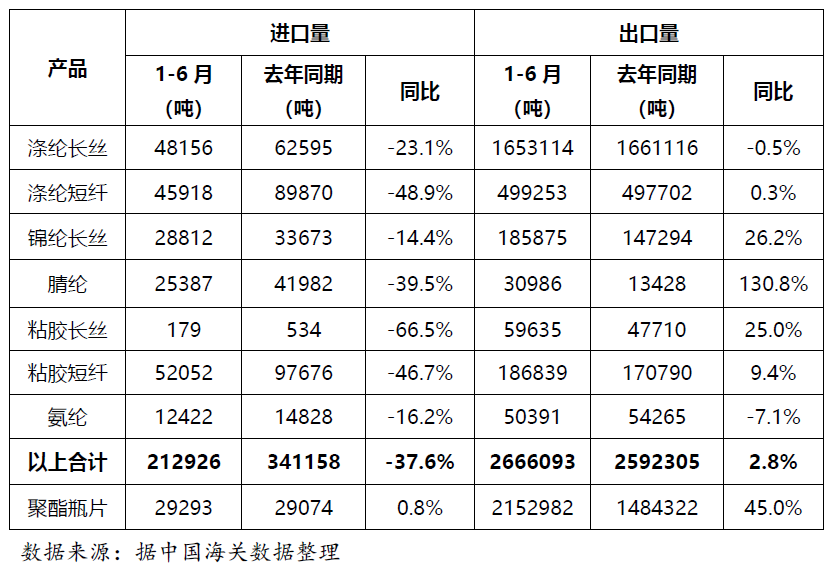 据海关数据统计(表2),1-6月化纤主要产品合计进口量同比减少37.6%,一方面反映国内市场需求减弱,更重要的是国内化纤产品从品种和质量上已能够满足下游需求