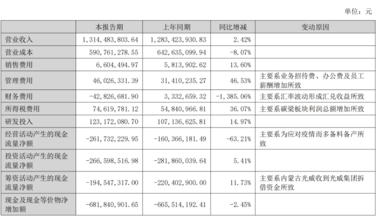 DT新材料获悉,8月15日,光威复材发布2022年半年度报告,2022年1-6月营业收入为1,314,483,803.64元,比上年同期增加2.42%;归属于上市公司股东的净利润为505,581,323.71元,同比增加16.48%,平均毛利率为55.06%,行业内略低于中简科技(69%左右)