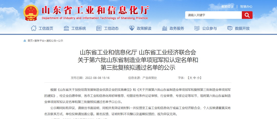 省级制造业单项冠军企业为在山东注册的,国jia级专精特新“小巨人”企业和年销售收入1亿元以上的省级专精特新企业,长期专注并深耕于产业链某一环节或某一产品领域,从事相关业务领域的时间达到3年及以上;主营产品销售收入占企业主营业务收入的比重在70%以上;企业产品市场占有率位居前5位且全省第yi位的企业。