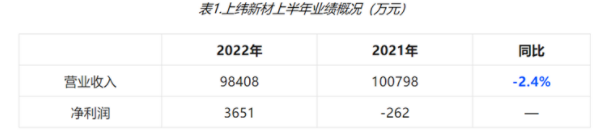 上纬新材:上半年实现营业收入9.84亿元,同比减少2.4%;净利润3651万元,同比扭亏为盈。