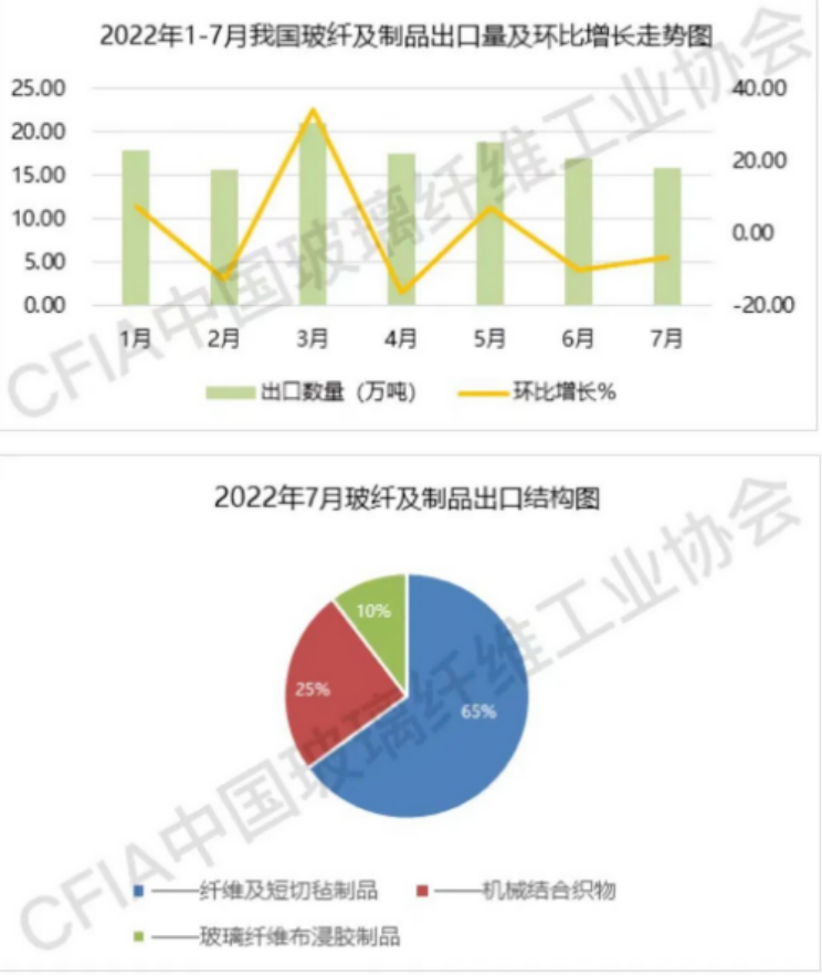 2022年1-7月,我国玻璃纤维及制品累计出口量为123.64万吨,出口金额累计22.67亿美元。其中,7月单月玻璃纤维及制品出口量为15.84万吨,环比下降6.49%;出口金额3.13亿美元,环比下降4.86%。纤维及短切毡制品、机械结合织物和玻纤布浸胶制品三大类产品7月出口量分别为10.29万吨、3.9万吨和1.65万吨,分别占比65%、25%和10%。34项具体税目产品中,出口量居前三位的分别是无捻粗纱、短切原丝和化学粘合毡,分别达到5.69万吨、2.35万吨和1.33万吨,三类产品出口量占出口总量的59%。此外,7月出口产品环比增长多的为机械结合的玻璃纤维制垫,出口数量为0.13万吨,环比增长46.88%。