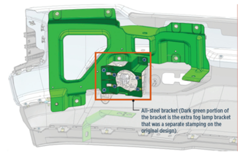 该团队想要解决的另一个问题是,由于钢的成形性限制,不能将基准支架成形为可以固定车辆雾灯的形状,这就需要增加一对较重的金属支架。如果可能,该团队希望将雾灯支撑架整合到复合材料的支架上。