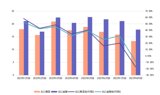 2022年8月,我国玻璃纤维及制品出口量为13.35万吨,同比降低17.12%;出口金额为17.75亿元,同比降低8.69%;出口均价为13293.63元/吨,同比上涨10.17%。。