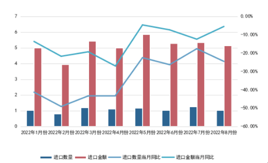 2022年8月,我国玻璃纤维及制品进口量为1.02万吨,同比降低24.59%;进口金额为5.15亿元,同比降低5.56%;进口均价为50541.69元/吨,同比上涨25.24%。