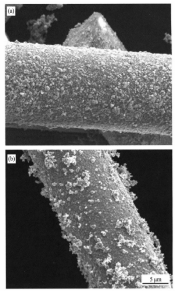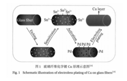 Xu等将玻璃纤维蚀刻、敏化和活化,采用乙二胺四乙酸二钠(EDTA-2Na) 络合剂和N2H4-H20还原剂,通过化学镀层的方法制备了镀Cu玻璃纤维,如图l所示。