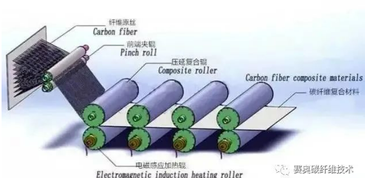 由纤维束拼成所需的含量及宽度,然后经纤维架将纤维均匀的分开,同时树脂加热后涂布在上下离型纸上。将纤维及涂布树脂的上下离型纸同时导入滚轮中,纤维位于上下离型纸之间,借由滚轮的压力将树脂均匀的散布于纤维之间。纤维含浸树脂后经过冷却或烘干,经捲取器捲取成捲轴状。