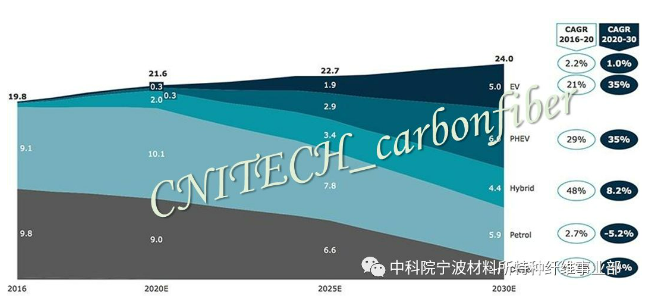 与乘用车高速发展趋势相反,利用石油或柴油尤其是柴油发动机为动力的乘用车销售将大幅下降,以EV / PHEV为代表的新能源汽车复合年增长率预计将大幅增长35%,快的成长期2025 -2030。