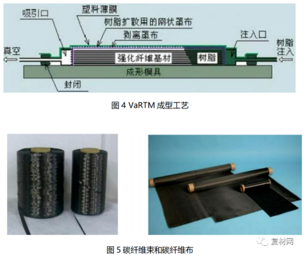 CFRP 螺旋桨采用真空辅助树脂传递成型(VaRTM)工艺,通过碳纤维的树脂浸渍及固化制作而成。VaRTM 成型法是指在成形型(成形模具—译者注)上先铺设强化纤维基材(玻璃纤维或碳纤维等编织物),用塑料薄膜封闭后再抽成真空,然后将液状树脂注入,由负压原理使其完全浸入纤维基材各处并使其固化。为方便树脂浸入(扩散)及获得较好的叶片表面,在强化纤维基材与成形型以及塑料薄膜之间分别使用了专用的网状罩布和剥离罩布。