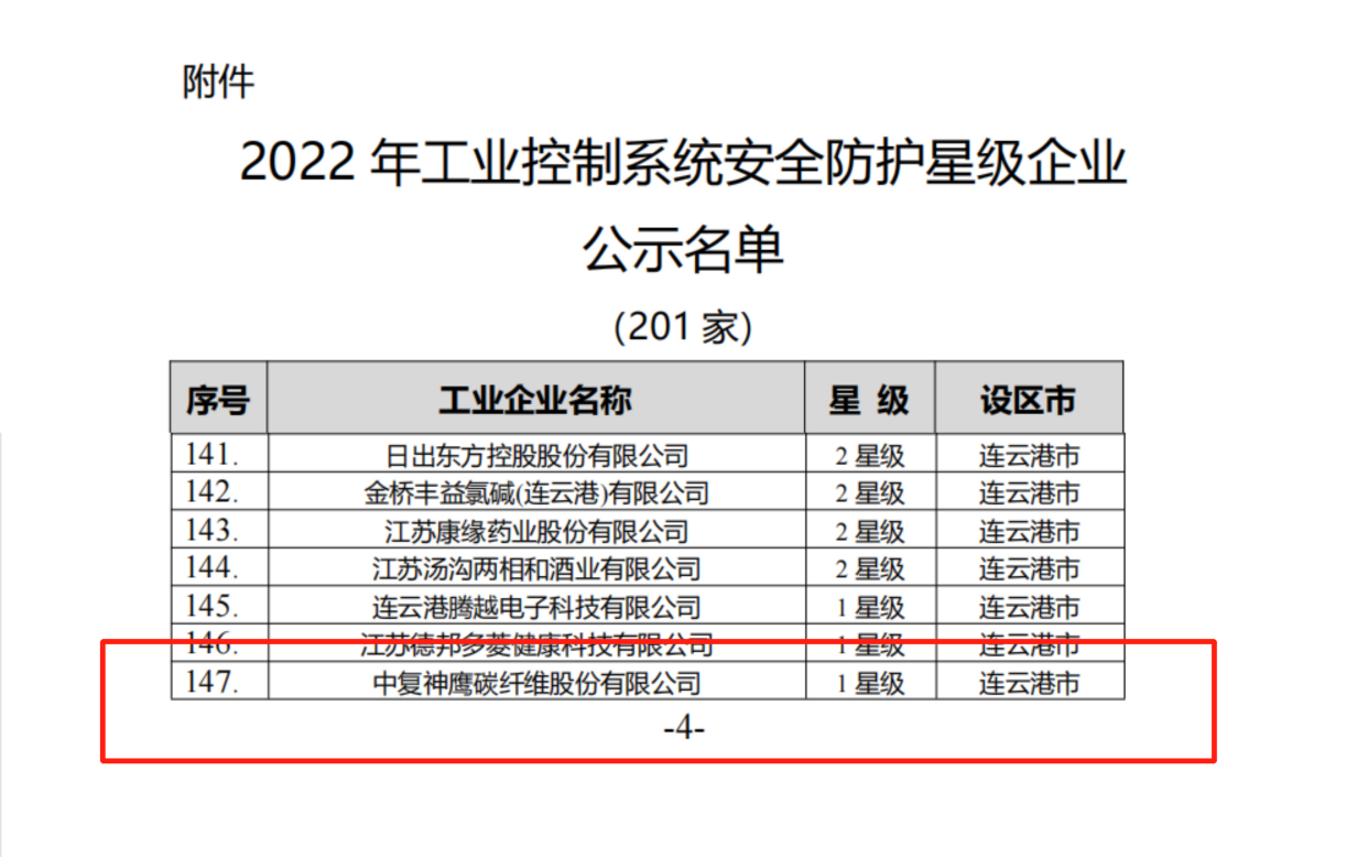 近日,江苏省工业和信息化厅公示了2022年度工业信息安全防护星级企业名单,中复神鹰碳纤维股份有限公司入选2022年工业控制系统安全防护星级企业,连云港市共7家企业入围。